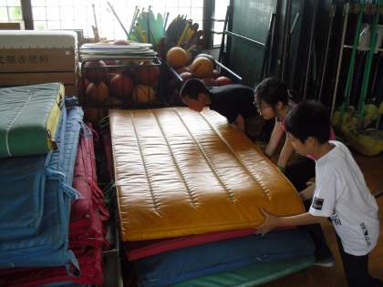 委員会活動で,体育館倉庫の掃除,整理整頓をしました。跳び箱・マット・室内用のボールなどをきれいにしました。最後は,美しくなった倉庫の前で記念撮影!