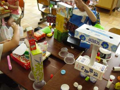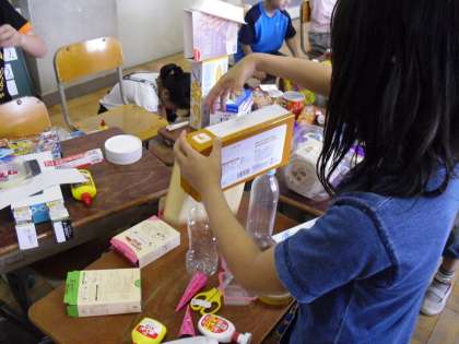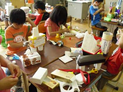 空き箱や空き容器を材料に,「おはなしロボット」の制作を始めました。みんな思い思いにロボットを作っています。