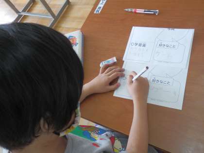 6月2日(火),2時間目の後半に生き方探究パスポートを書きました。書く前に,まずみんなで今までにできるようになったことや,取り組んでいたことを振り返って思い出しました。その中で,昨年の目標ができるようになって,新しいことに取り組むことを考えたり,まだできていないので引き続き取り組みたいと考えたりしていました。みんなで振り返った後は指導者と話をしながら生き方探究パスポートを書きました。は組の生き方探究パスポートは「きらめき」という名前です。一人一人がきらめくために学習面と生活面の目標を考えました。自分でできるようになりたいことを考えて書いていました。これから,今日書いた目標を達成するために取り組んでいこうと思います。