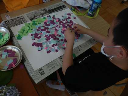 6月8日(月)5・6校時,図画工作の時間にアジサイの貼り絵をしました。まず,紫やピンク,水色などの色画用紙テープの中から,自分で選んだアジサイの色をとりました。色は,3時間目の体育が終わった後,校庭に咲いているアジサイをみんなで見て決めました。次に選んだ色の色画用紙テープをはさみで小さく,大体同じ大きさに切りました。色画用紙テープの切る部分だけ手の先に出して,はさみは体の前で使って切るように練習しました。それから,画用紙におよそのアジサイの輪郭の丸を書きました。丸もおよそうまくかけていました。いよいよ貼って作品作りです。のりを適度な面積に塗り,その上に切った色画用紙テープを貼ります。指で小さく切ったテープをうまくつまんでのりの上にのせて貼っていきました。大胆に貼っていく児童もいれば,丁寧に並べる児童もいました。また,色を考えて貼る児童もいれば,適当につまんで貼る児童もいました。アジサイが貼れたら,あとは葉の緑色を貼って完成です。は組に個性豊かなアジサイがたくさん咲きました。