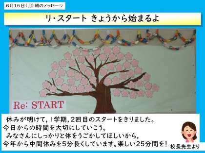 3か月の長きにわたり,子供たちの家庭学習面では,保護者の皆様は大変お世話になりました。おうちできめ細やかに家庭学習に関わってくださったり,子供たちのストレスに向き合い,寄り添っていただいたりなど,保護者の皆様には様々な面で学校教育を支えてくださったことに,改めて感謝申し上げます。