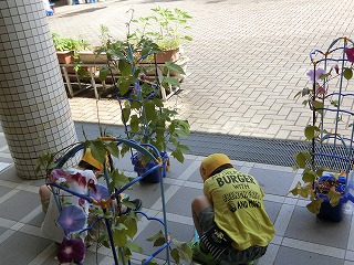 ご家庭でも協力いただき,1年生が一生懸命に育てているアサガオが花を咲かせ始めています。