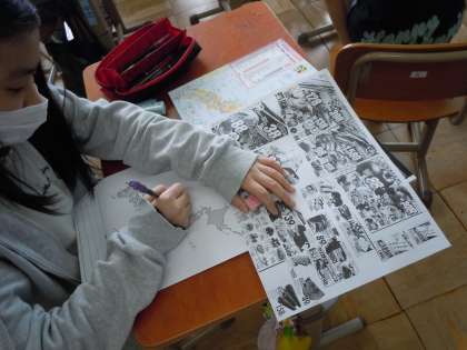 今日は,「給食の食材はどこからきているのだろう?」という投げかけから学習をスタートし,チラシの情報をもとに産地調べをしました。