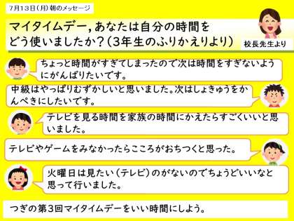 週1回学習以外でメディアから離れて自分を高める時間をすごすことを目標にしているマイタイムデーの取組,今回は3年生のチャレンジシートの振り返りを紹介します。