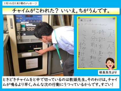 次の時間の用意をしてから遊んでいる。昼休みの終わる数分前には掃除場所に向かっている,見通しを持って行動する姿をあちこちで見かけるようになりました。