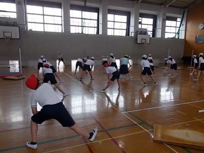 準備体操や後片付けをします。準備運動は「楽しいスポーツ委員会」の人達を中心に進めています。そして,高跳びの活動が終わった後,みんなで協力して後片付けをします。自分の班が使った用具以外も声をかけ合って助け合いながら全員で片付けることができます。とても素敵な姿です。