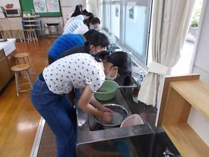 家庭科の時間に「手洗いで洗濯」の学習をしました。事前に手順を調べ,今日はその手順通りに洗濯できるように実習しました。1日使ったハンカチを各自で洗濯しました。もみ洗いやつまみ洗い,すすぎまでしっかりやりました。そしてしわにならないように干して乾くのを待ちます。明日しっかり汚れが取れてきれいになっているか確認するのが楽しみです。