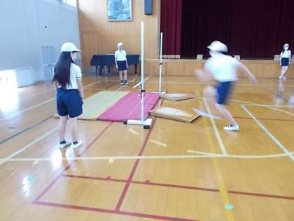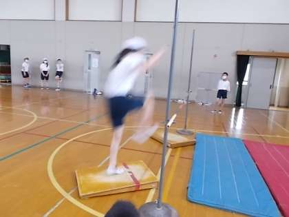 単元,最後の学習でした。リズミカルな助走から力強い踏み切りで跳び越すことができるようになりました。みんなのふり返りからは,「最初の記録と比べると20cm以上高く跳べるようになった」「踏み切るタイミングがわからなくなったので学習の場を工夫した」「友達とアドバイスをし合えたのが良かった」などの感想がみられました。