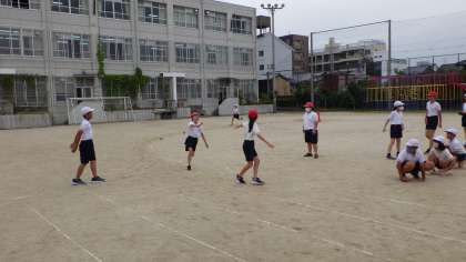 体育の学習でリレーに取り組んでいます。チームのタイムが縮まるように,走順やバトンパスの仕方を工夫しながら,励ましあって活動しています。