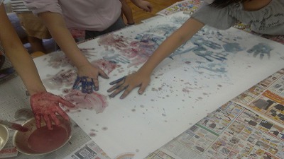 「とにかくたくさん手形をつけよう」「水っぽくした方が面白いんじゃない?」