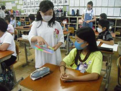 新しい生活スタイルの中でもリーダーシップを発揮して頑張っている6年生に,1学期「幸せカード」を作ってプレゼントしました。そして,先日,そのお礼にと図画工作でつくったネームプレートをもってきてくれた6年生。一人ひとりの名前からデザインした,世界に一つだけのネームプレートでした。なかなか異学年との交流もできない中で,このような時間をもてたことがとても嬉しかったです。先輩とのやり取りを通して,人と人とのつながりを大切にしたいと,より一層思うようになりました。
