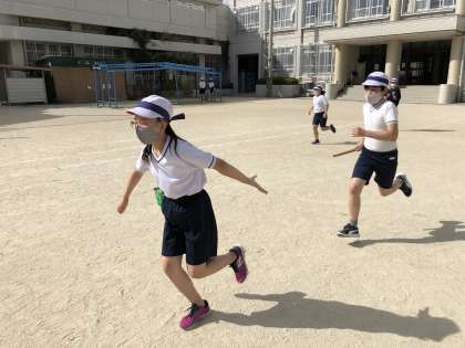 今日は全員リレーの練習で,チームに分かれてバトンの渡し方確認をしました。