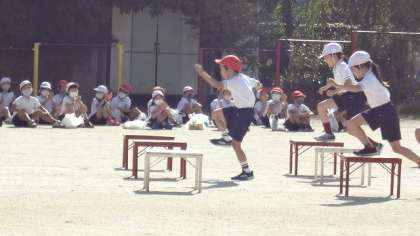 2年生は,50m走と,朱二っ子探検隊(障害物走)の2つの競技を行いました。