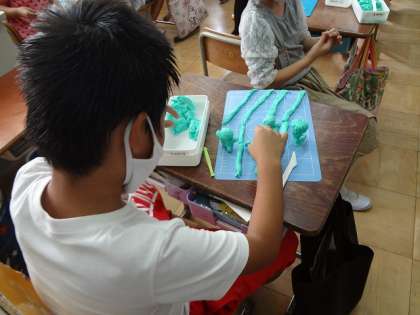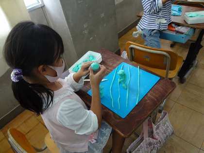 「頑張って走ったから,50m走で走っているところにしよう。」「応援してもらって嬉しかったから,ゴールの近くで応援してくれている人も作ろう。」など,体育DAYを振り返りながら,熱心に粘土を形にしていました。