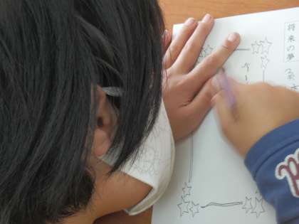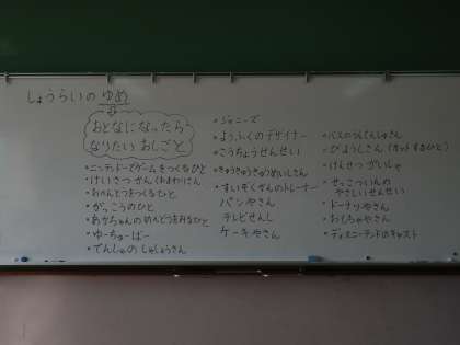 10月16日(金),道徳の時間に,全校道徳に向けての取り組みの一つとして,将来の夢について話し合いました。はじめに,みんなで将来やってみたい仕事や知っている仕事をたくさん出し合って,仕事のイメージを膨らませました。水族館の飼育員さんや救急救命士さん,パン屋さんなど黒板がいっぱいになるほどいろいろな仕事が出ました。交流をしたことで自分が知らなかった仕事を知ることができた児童もいました。それから,もう一度自分が将来やってみたい夢をワークシートに記入しました。はじめに発表したことを書く児童もいれば,黒板に書かれた仕事見て悩んで書く児童もいました。全校道徳の学習では,将来の夢に向かって自分がどのように取り組むかを話し合います。毎日の学習にいかせるようにできればと思います。
