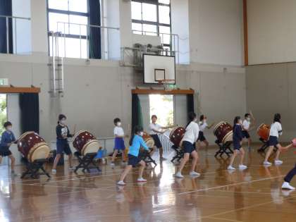 ソーラン節の踊りについて,ひとつひとつの動作の意味を交えながら教えていただいた後,全員が和太鼓を叩かせてもらいました。