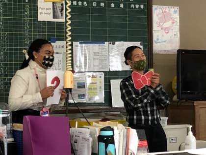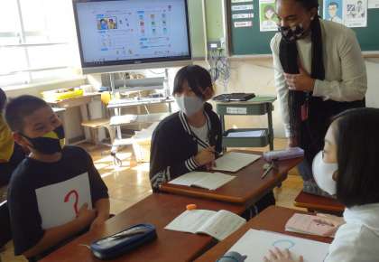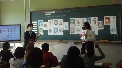 全員でデモンストレーションを見てからペアで職業や性格,できることや出身地などをヒントに誰かを当てます。