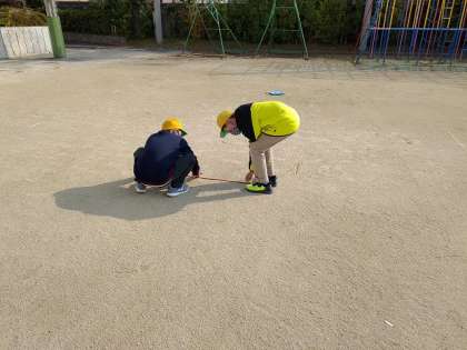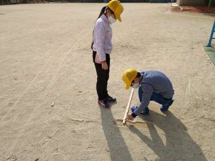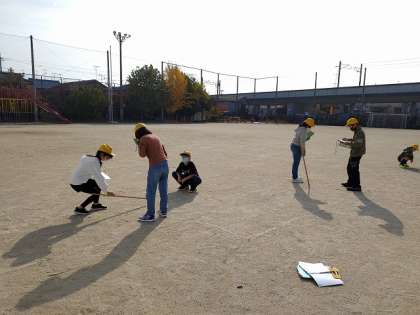 算数「平均とその利用」の学習で,平均を使って歩幅を求める方法を考えました。1歩の歩幅が分かれば「歩幅×歩数」で距離が求められます。1歩の歩幅には誤差があることから,10歩ずつ5回歩いた距離の平均から1歩の歩幅を求めるようにしました。