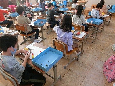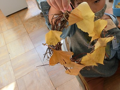 「黄色の葉っぱで色を揃えたいな」「アサガオの種が取れたから飾りにしよう!」等々,それぞれが自分の思うように飾り付けを楽しんでいます。