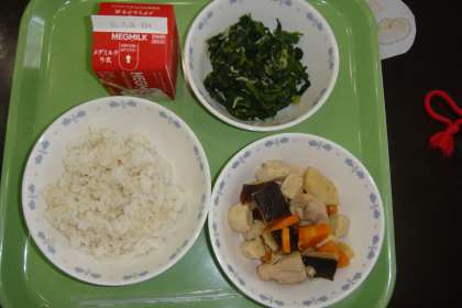 今日の献立は,「麦ごはん・牛乳・高野豆腐と野菜のたき合わせ・ほうれん草とじゃこのいためもの」でした。