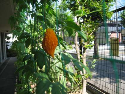 緑のカーテンのゴーヤも早いものはオレンジに色づいてきました。