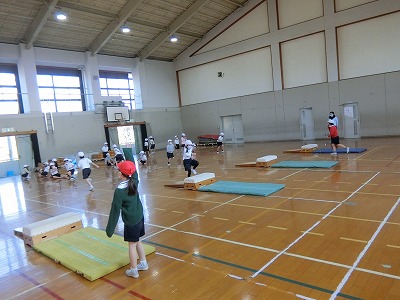 踏み越し跳びや飛び乗り等,基本的な動きから練習していますが,子どもたちはやる気満々!