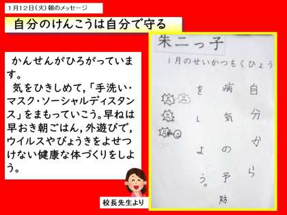 子どもたちにも感染拡大防止の再徹底を指導するとともに,主体的に健康な体づくりについて考え実践できるよう,指導や声かけをしていきます。