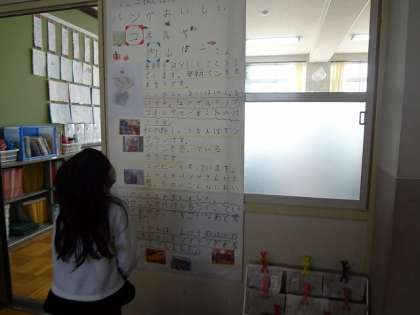 2年生の教室前の廊下には,子供たちがまとめたポスターを掲示しています。他のチームが調べたことを,興味津津で読む姿が見られました。最後のまとめの時間には,「朱二校区で働いている人は,いろんな工夫をして頑張っていることが分かりました。」と働く人の努力や工夫への気付きもありました。