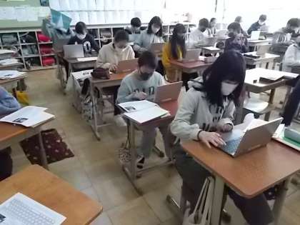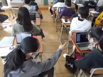総合の時間に「働く意義」について考えています。今はレポートにまとめる学習をしています。今日は中間交流で自分の考えを,先週導入された1人1台のパソコンを使って打ち込みました。次の時間はそれを交流しようと思っています。