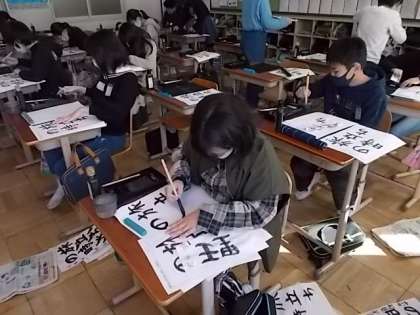 6年生の学習のまとめとして毛筆で「旅立ちの時」と書きました。これまでに学習してきたことを生かして,自分のめあてを選び,字配りよく書くことを目標に学習を進めました。みんなからは,「書写以外の学習でも文字の大きさや配列など,字配りに気を付けて書けるようにしたい」と日常に生かそうとするふり返りが見られました。