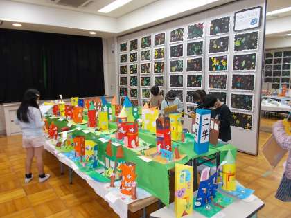 今年の2年生の作品の様子です。平面作品は,「たのしくうつして」です。宇宙をイメージした紙版画に挑戦しました。宇宙に行って,どんなことがしてみたい?どんなものがあったらわくわくするかな?と,想像力をふくらませて,思い思いに仕上げました。