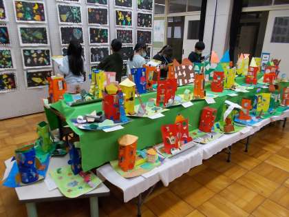 立体作品は,「まどをひらいて」です。窓の形は,初めてカッターに挑戦しました。一生懸命考えた形を丁寧に切取り,窓の中の景色や,建物のまわりのかざりも,工夫しました。