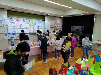 25日,26日に図工展を行いました。5年生は,彫り進み版画と伝言板を展示しました。