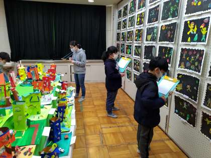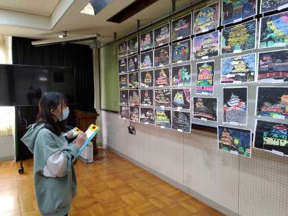 彫り進め版画は,動物や植物をテーマとし,色を残すを部分を彫って,色の重なりや完成形をイメージしながら取り組みました。伝言板は,電動糸のこぎりを使って曲線を切り,やすりで角を整えて,着色し,世界で一つだけの伝言板を作りました。観賞の時間には,他の学年の作品のよいところを見つけたり,自分の作品と友達の作品を比べたりして,面白さや楽しさを感じ取ることができていました。