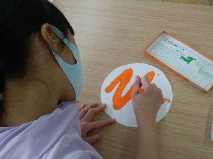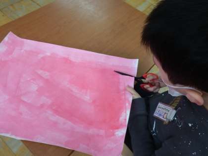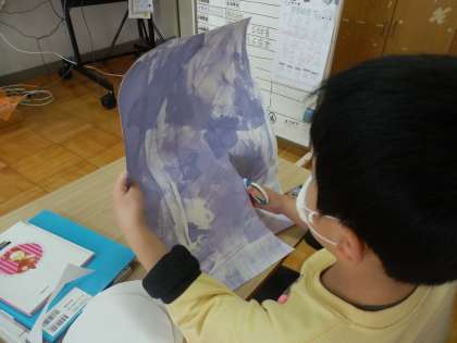 3月2日(火),6年生の卒業をお祝いするために掲示板に貼る飾りの仕上げをしました。外国語活動やタブレットのアプリなどの学習でなじんでいる「はらぺこあおむし」の最後に出てくる蝶と言葉を書いた風船を作りました。蝶の羽は,以前にローラーで色を着けて自分たちで作った色画用紙をいくつも切って,エリック・カールさんのように貼り合わせて作りました。羽の部分の形に切るので,丁寧に線に沿ってはさみで切りました。また,白い画用紙を円に切って,自分の担当する文字に色を塗りました。はみ出さないように丁寧に色を塗りました。どの児童も一生懸命に取り組んでいました。円や曲線を切るはさみの使い方,文字の色を塗る様子を見ているとどの児童も以前より上手になっていて,この一年で成長した様子が見てとれました。模造紙横4枚分の大きさ作品ができました。6年生が喜んでくれたらいいなと思います。