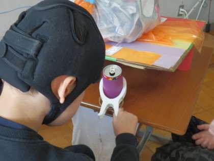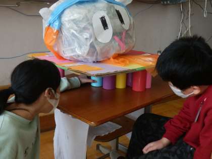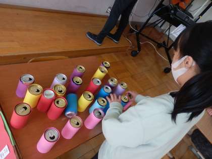 今,生活単元学習の時間に,缶ぬきゲームをしています。色画用紙をまいた缶を並べ,その上に大きなキャラクターの頭を載せ,崩さないように順番に缶を抜くゲームです。缶にまいた色画用紙の色で得点が決まっていて,順番に缶を抜いて得点を競います。児童は,勝つために,得点の高い缶はどこにあるのか,崩れないように抜きやすい缶はどれか,考えながら見通しをもって缶を抜いています。また,頭が載せてある段ボールに触れたり,抜こうとしている缶と違う缶に触れたりすると減点されるので,力の入れ方を工夫しながら丁寧に慎重に缶を抜こうとしています。チーム戦をする時は,同じチームの友達とどの缶を抜くか相談しながらゲームを進めています。児童はいろいろな力を使って楽しみながらゲームに取り組んでいます。