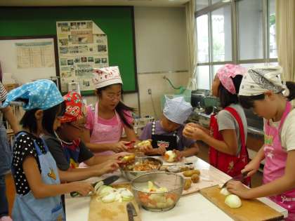 たくさんの保護者の方々に見守られる中,同じグループの子ども達同士で協力して,野菜を洗ったり,皮をむいたり,切ったりしました。みんながいっせいに玉ねぎを切った時には,「目が痛い〜!」という声が,あちこちで聞こえていました。