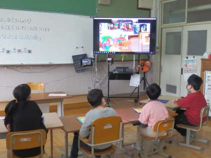 3月8日(月),ズームで今年度最後の「2・4・6・8なかよし会」が行われました。最後は1年間の振り返りです。「なかよし会でがんばったこと」「1年でできるようになったこと」「来年度がんばりたいこと」を一人ずつ発表しました。作った作品を見せながら発表したり,教室でできるようになった縄跳びを跳んで見せてくれたりと工夫した発表もありました。は組の児童はこの日のために練習してきました。それぞれ自信をもってゆっくり大きな声で発表できました。終わるとき,今年度最後なので名残惜しかったようです。今日の振り返りをすると,みんな満足した出来だったようです。また,他校の友達のすごかったところも見つけて発表できました。しっかり聞けていたと思います。来年度も交流の中でお互いに高めあっていきたいと思います。