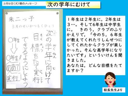 大切な時間をどう過ごすか考えるのが,今月の児童会の「朱二っ子の生活目標です。1年間,子どもたちが考えためあてを全校で取り組み,月の終わりには子どもたちも教職員もふりかえりをしてきました。1年間の成長が感じられるように過ごしたいです。
