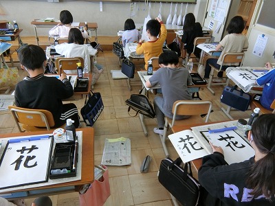 4年生の最初の書写の学習では,筆使いや画の方向に気を付けて,「花」という漢字を書きました。この漢字には,はねやとめ,はらい等,3年生で学習した要素が詰まっています。これまでに学習してきた内容を確認しながら,それぞれが一生懸命に「花」という字を書きました。