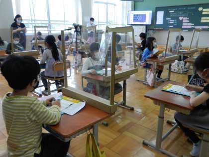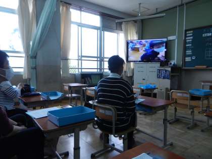 コロナ感染予防のために授業者の教室で見るグループ,別の教室でテレビを見るグループといった方法で,密を避けて行いました。
