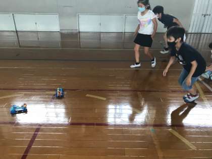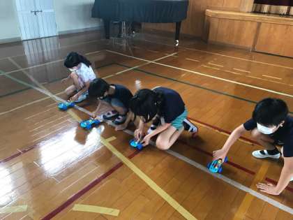 今日はお楽しみ♪実験キットを車に改造!体育館で走らせます。「あれ?後ろに走るよ!」「なぜか動かないな…」「乾電池の向きに気を付けないと!」友達同士アドバイスしながら走らせました。