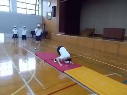 体育の時間にマット運動を行いました。今日は,久しぶりのマット運動だったので体慣らしを行い,今自分にできる技を確認しました。次回からの学習は連続技や組み合わせ技,少し頑張ればできそうな技にチャレンジしていきます。自分のめあてに向かって頑張ってほしいです。