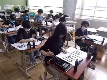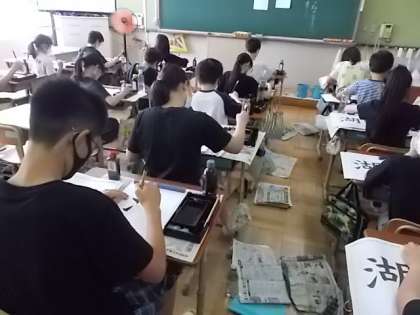 今日は,三つの部分の幅の違いと点画の形の変化に気を付けて『湖』という字を書きました。姿勢を正して集中して字を書くことができました。ふり返りでは,「三つの部分の組み立て方に気を付けて書くことができたので,硬筆でも字形を整えて書いていきたい」「組み立て方に気を付けて書くと,字形を整えて書くことができた」などの声が聞こえました。