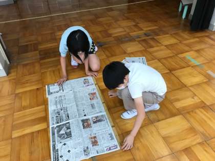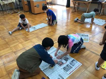 4年生は算数科で面積の学習中。今日は,新聞紙をつなげて1平方メートルをつくりました。ペアで協力して一つ作ります。作った1平方メートルを見ながら,「黒板は3平方メートルぐらいかな?」「1平方メートルに何人ぐらい入れるかなぁ」とつぶやいていました。