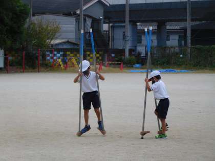 体育では,フラフープや棒,竹馬などの用具を使ったあそびをしています。