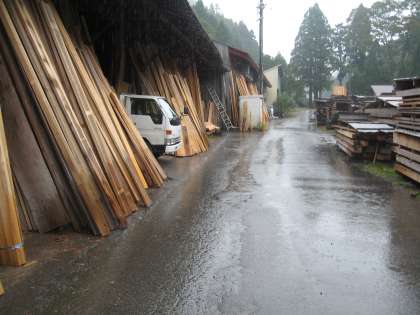 お昼は製材所付近の資材置き場の軒先をお借りして雨にぬれることなく昼食を終えることができました。
