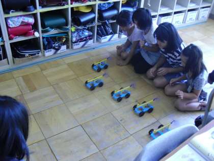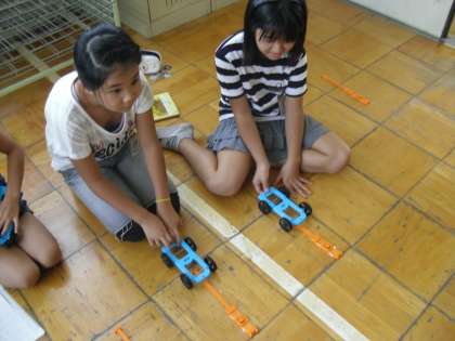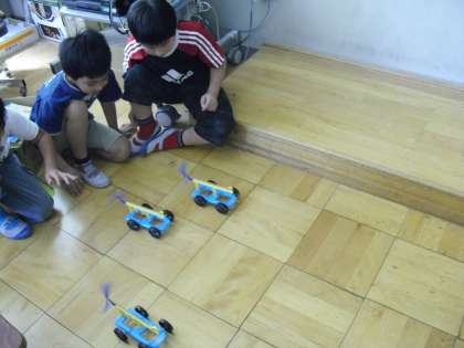 風の次に、「ゴムのはたらき」について調べました。ゴムは、ひっぱられたら縮もうとします。(1)ゴムを短く引く時と、長く引く時では、車の動き方はどう変わるでしょう。(2)ゴムが1本の時と、2本のときでは、車の動き方はどう変わるでしょうか。ゴム巻きのプロペラも使いました。