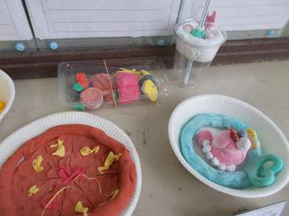 いろいろな食べ物をねんどでつくって,みんなでパーティーをしました。