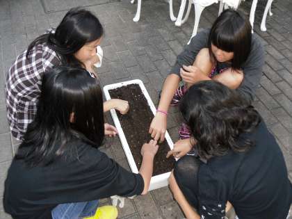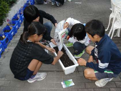 お話を聞いた後は,ランチガーデンで,いよいよ種まきです。